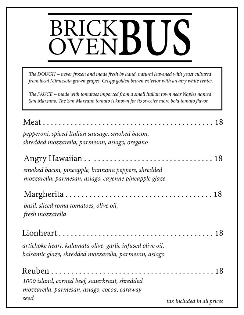 Brick Oven Bus is a Minnesota born food truck! We cook wood-fire pizza out of a short school bus. It is hard to miss on the streets of MN because our bus has a four foot tall brick chimney sticking out of the top.